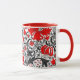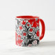 Caneca de café numa vintage, William Morris impressão floral de lírios estilizados e irlandeses, melhorada digitalmente e colorida, em tons de cinza/cinza e folhagem preta, com flores vermelhas profundas, sobre fundo branco