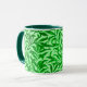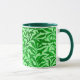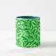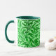 Mug em um padrão antigo William Morris de ramos estilizados salgados, em verde esmeralda médio a escuro, em um fundo verde-hortelã claro