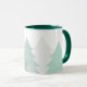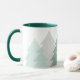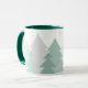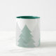 This ceramic coffee mug is shown in a refreshing image of woodlands fir tree print.