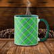 Uma caneca de café com um padrão verde fresco de pré-disquete com pequenas tiras brancas e azuis.