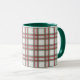 Xadrez vermelha, branca e verde dão a esta caneca de café um sentimento festivo de feriado.