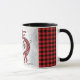 Personalize esta Xadrez Vermelha E Negra Kokopelli Mug. Ele apresenta uma Xadrez vermelha e negra, Kokopelli, tocando flauta com notas musicais em um fundo prateado de Natal com flocos de neve, cercado por bordas de Xadrez Vermelha e Negra e as palavras de uplifação... "Paz na Terra"! Design De Arte Original Pelo Artista Kerry Miller.