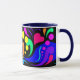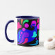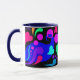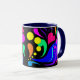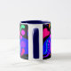 O primeiro de 4 canecas com punhos e dentro coloridos. O design neste tem corações, bolhas e redemoinhos em cores corajosas, bonito em um painel preto. O punho e o interior são azul marinho.