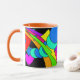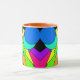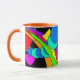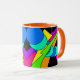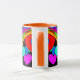 O ò de 4 bonitos, canecas coloridas. O design é um abstrato dos corações, dos arcos-íris, dos pontos e de mais em brilhantes, cores do divertimento em um painel preto. O punho e o interior são alaranjados.