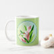 Grandes flores com folhas longas e um beija-flor-de-garganta-rubi dentro de um círculo.