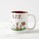 Café da ilustração dos desenhos animados/caneca do chá com imagem de dois cães e de dois gatos que olham a suspensão feliz para fora como melhores amigos com o texto popular BFF (melhores amigos para sempre) sobre a parte superior da imagem dos desenhos animados. Personalize para trás da caneca com uma mensagem para seu melhor amigo para sempre.