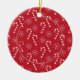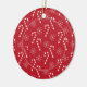 Um adorno de fotos de cachorro vermelho com uma bengala doce e um padrão de flocos de neve. Adicione o nome do seu cão se desejar. © ArianeC Ilustrações — Todos os direitos reservados