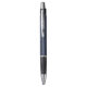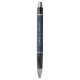 Caneta azul promocional com o seu nome ou marca empresarial em uma assinatura elegante e branca e o seu texto adicional em letras modernas e simples.