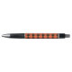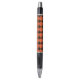 Esta caneta espetacular apresenta uma aranha preta assustadora com oito pernas peludas, olhos amarelos com grandes pupilas pretas e sua boca aberta mostrando suas presas. Há um texto laranja que diz "Feliz Dia das Bruxas" e um fundo laranja correspondente.