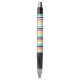 A caneta apresenta um design vibrante e atraente para os olhos com listras em várias cores, incluindo rosa, verde, amarelo e preto. A combinação dessas cores cria uma estética alegre e enérgica. As faixas são colocadas sobre um fundo branco, fornecendo um contraste impressionante.