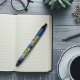 Um dragão chinês verde com um peixe koi laranja com flores de lótus e flores de cereja contra um pano de fundo de azul escuro.