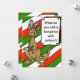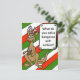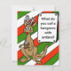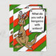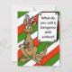 Cartão de Natal festivo com fundo vermelho branco e verde listrado. Cartoon canguru com galhadas e nariz vermelho e enigma ou piada de Natal para crianças na frente