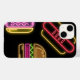 .: Dois cachorros-quentes neonônios e um hambúrguer sobre fundo preto contrastante: Diversão de design por 7 Anos de Idade