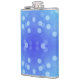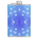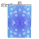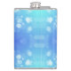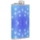 A metal flask featuring a vibrant blue background with light blue bokeh circles. The design creates a playful and modern feel.