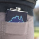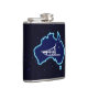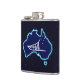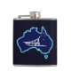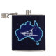 Fique aquecido na trilha. Uma simples silhueta branca de um trenó de cão e a Cruz do Sul sobrepuseram-se a um mapa azul da Austrália. Tudo num fundo estrelado. Quem teria mordido? Mudando de cabeça para baixo em Oz. O trenó de cachorro é bastante popular na Austrália. No Monte Hotham em Victoria há uma grande corrida todos os anos.