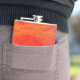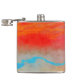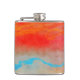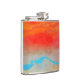 Um design abstrato de um pôr do sol oceânico com cores ousadas em vermelho, laranja, ciano, azul e bege.