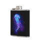 Água-viva grande, azul, desenhada artisticamente, brilhante, brilhante, com longos tentáculos sobre fundo preto com bioluminescência roxa. Água-viva luminosa.