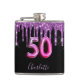 Um presente de amigos para uma menina de 50 anos, menina de mocinha e glamourosa. Um fundo preto clássico com brilho púrpura, pingos, pintura pingando. Personalize e adicione um nome.O texto: O nome é escrito em violeta com um script de estilo moderno com letra de mão. A idade 50 é escrita com uma fonte do estilo do balão de tendência. Voltar: adicione seu texto e nomes.