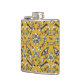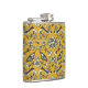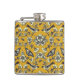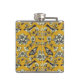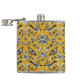 Este frasco apresenta aves, flores, abelhas e borboletas em azul-marinho e creme sobre fundo amarelo-mostarda.