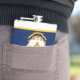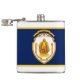 Flask com a bandeira de Springfield, Massachusetts. Uma bandeira azul com contorno amarelo e branco e a ilustração da estátua de Santo Augustus Gaudens no centro