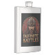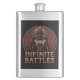 Um design ousado e dinâmico que apresenta o texto "Batalhas Infinitas" em uma paleta tradicional de cor Viking de vermelho e ouro. As palavras são dispostas em um estilo poderoso, angular, reminiscente de antigas cordas. O fundo é uma superfície texturizada, meteorizada, acrescentando um senso de autenticidade e significado histórico.