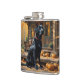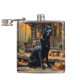 Um belo Labrador Retriever negro senta-se em frente a uma cabana acolchoada na floresta no outono
