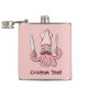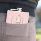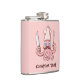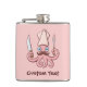 Cartoon de chef rosa com bigode segurando faca e garfo de cozinhar. Cor de fundo personalizada. Texto personalizado.