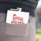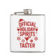 Quote: Official Holiday Spirits Taster. Red text. Decorated with glasses of wine, Santa's hat, coctail glass and snow crystals,