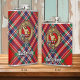 Crachá da crista Clan MacFarlane rodeado por uma correia e fivela sobre o tartã vermelho. Custom Text.
