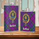 Crachá da crista Clan Wardlaw rodeado por uma correia e fivela sobre o tartan. Custom Text.
