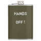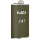 Um frasco de bolso elegante em cor khaki simples. Texto moderno em branco esbranquiçado lê "Hands Off". Um presente divertido e ótimo para casamentos, aniversários e ocasiões especiais.