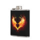 Coração de anjo com asas flamejantes em fundo preto.