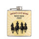 Brinde ao grande adeus do noivo! Adicione o nome do padrinho. Este cantil de despedida de solteiro apresenta quatro silhuetas de cowboy cavalgando para frente contra um ousado pôr do sol ocidental com listras coloridas, junto com a frase "O Último Rodeio do Noivo". Perfeito para manter a celebração animada durante as excursões aos bares, aventuras ao ar livre ou festas com tema country em Nashville, Austin, Las Vegas ou mesmo em casa. Uma lembrança divertida e funcional para a noite inesquecível do noivo.