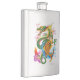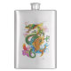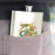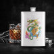 Um dragão chinês verde com um peixe koi laranja com flores de lótus e flores de cereja contra um pano de fundo de azul escuro.