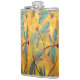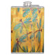 Lindas libélulas aladas azuis e bronze flutuam sobre um fundo amarelo-ouro malhado.