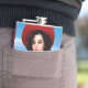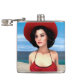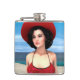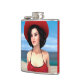 Renderização digital em 3D de uma jovem vintage vestindo um vestido vermelho de verão e um chapéu com bagagem no céu azul e fundo oceânico
