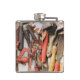 Uma coleção de ferramentas antigas antigas e vermelhas manipuladas em uma mesa num mercado de pulgas.