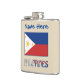 Hip Flask apresenta a bandeira filipina com a palavra PHILIPPINES embaixo da bandeira que combina! Acima, um lugar para o seu nome, em letras azuis, para personalização ou para criar uma aparência especial e personalizada. Maneira divertida de se lembrar de uma viagem, férias ou feriado. A bandeira é azul, vermelha e amarela. Útil numa reunião de família, viagem ou clube. Um presente de Dia de os pais muito apreciado.