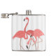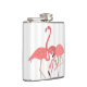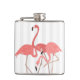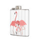 Um trio de flamingos cor-de-rosa para o verão e durante todo o ano para apelação tropical. Mostrado aqui sobre um fundo listrado de cinza pálida.