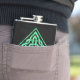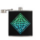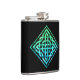Balão de licor de um design de nó celta azul-esverdeado em forma de diamante com borda sobre fundo preto.