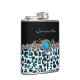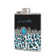 Frasco de moça-chic feito em preto, no topo, e um padrão-leopardo de neve azul-turquesa, branco e manchado preto, no fundo. Gráficos de uma borda com aparência de diamante ornamentado, com um bauble azul-turquesa, atravessam o meio do caso, contornando o padrão animal. O texto azul colorido está pronto para personalizar, para você mesmo ou como um presente elegante para ela.