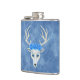 Este frasco de bebendo é uma mistura nefasta de tons azuis com uma cabeça de veado branco mítico com galhos brancos e vestindo três grandes rosas azuis na cabeça.