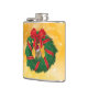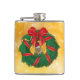 Este lindo pedaço vestindo um chapéu de Papai Noel está saindo atrás de uma coroa de Natal verde envolta com fita vermelha e dourada e um grande arco vermelho para celebrar o feriado.