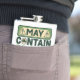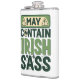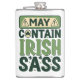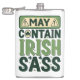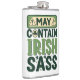 This modern typographic "May Contain Irish Sass" flask features a playful "warning label" aesthetic, complete with two caution triangles at the top flanking the word "MAY". The bold, blocky lettering uses a stylish palette of forest, sage, and kelly green, accented with a shamrock icon.