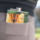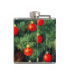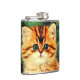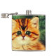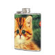 Flask com um gato natal vintage! Um gatinho laranja com listras pretas senta-se na neve. Atrás do gato está uma árvore de Natal com ornamentos vermelhos e amarelos. Também na neve há um presente vermelho. Um presente perfeito para a época de Natal e amantes de gatos!