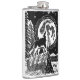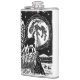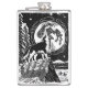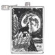 Linocut rústico preto e branco de um husky em pé no topo de uma montanha nevada uivando para a lua. Paisagem escandinava com montanhas, árvores e alces, e um céu estrelado acima.