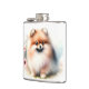 Um cão da Pomerânia fluffy com um casaco cor de laranja e branco vibrante, com olhos grandes e expressivos e uma expressão alegre. Fica em meio a flores macios, de cor pastel, e a aquarela suave, criando uma atmosfera quente e convidativa. O fundo é leve e arejado, melhorando o pelo liso do cão e o comportamento lúdico.
