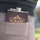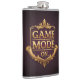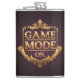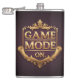 O design apresenta a frase "Game Mode On" em uma fonte dourada estilizada, maiúscula. As palavras são postas contra um rico pano de fundo vermelho veludo, com sutis destaques dourados para um ar de opulência e grandiosidade.