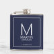 Esta garrafa apresenta o monograma e o nome do padrinho personalizados com título e data do casamento em estilo de fonte sans serif moderna em branco sobre fundo azul-marinho.