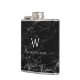 Um design moderno simples, mas elegante. Num fundo de mármore preto, há um grande monograma branco inicial, com o texto por baixo, também em bonés brancos.